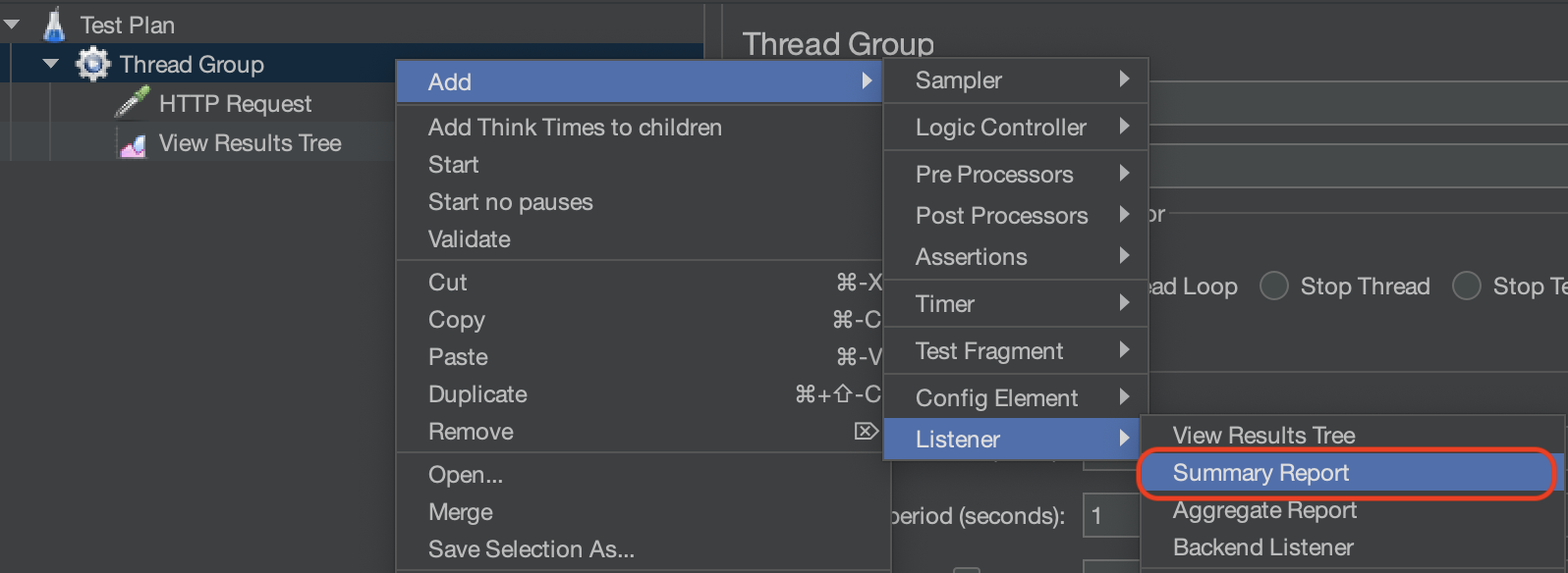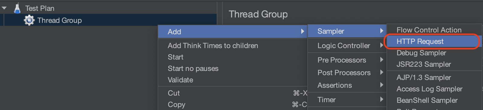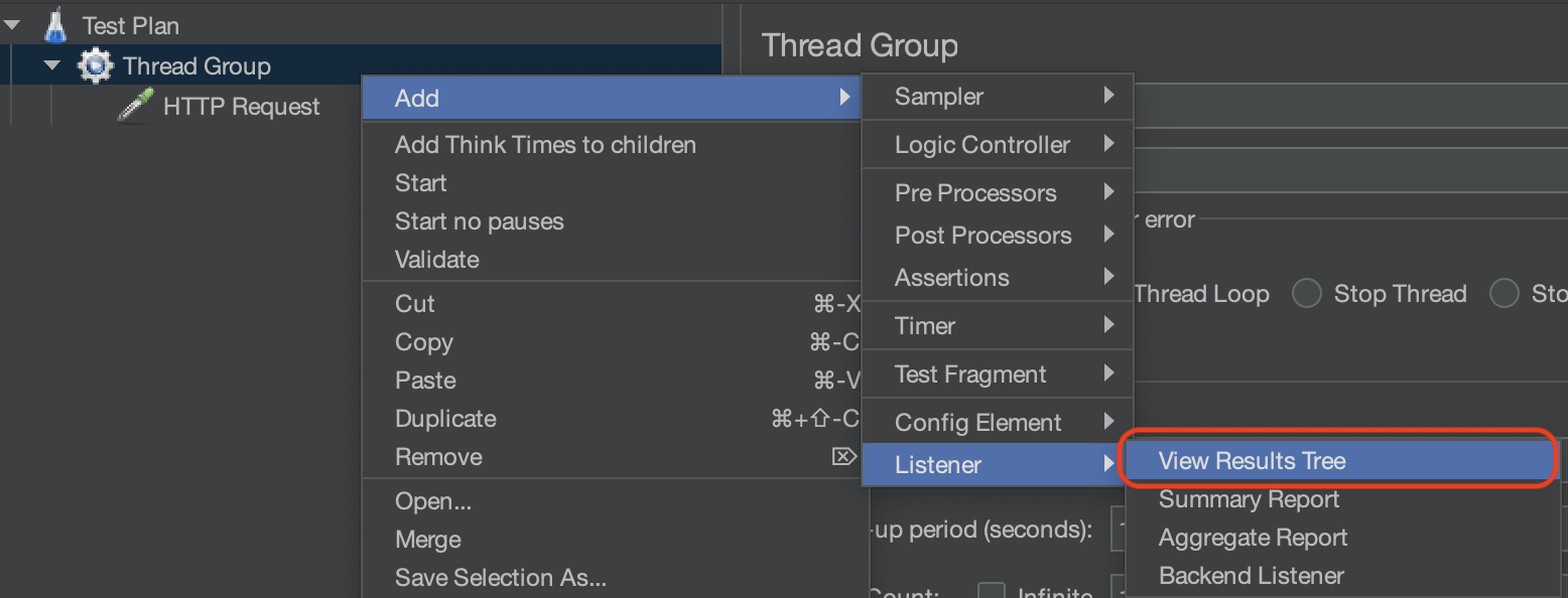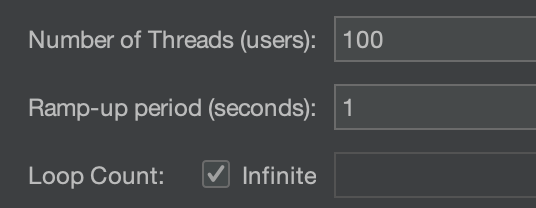 Number of Threads: 총 몇 개의 스레드를 생성할 것인지 설정한다.Ramp-up period: 스레드 수를 점진적으로 증가시키는 시간을 의미한다. 1초로 지정한 경우 1초 동안 점진적으로 스레드를 생성하여 트래픽을 발생시키게 된다.Loop Count: 스레드 그룹의 반복 실행 횟수를 의미한다. 10으로 설정한 경우 전체 스레드가 설정된 동작을 10번 반복하게 된다. Infinite를 체크하면 설정된 동작을 멈출 때까지 끊임없이 반복한다.