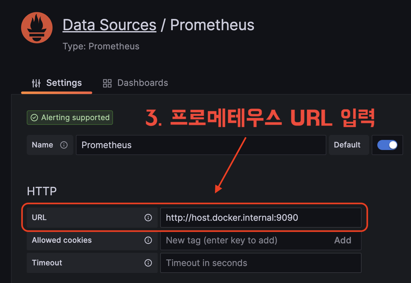 현재 상황을 바탕으로 조금 더 자세히 알아보자. 도커 컨테이너를 실행하고 있는 컴퓨터 입장에서는 프로메테우스, 그라파나가 각각 localhost:9090, localhost:3000에서 실행되고 있다. 하지만 그라파나 컨테이너 입장에서는 localhost가 컨테이너 내부가 되기 때문에 localhost:9090으로 프로메테우스 컨테이너에 접근할 수 없다. 따라서 컨테이너 내부에서 호스트에 접근하기 위해 host.docker.internal이라는 옵션을 사용하는 것이다.