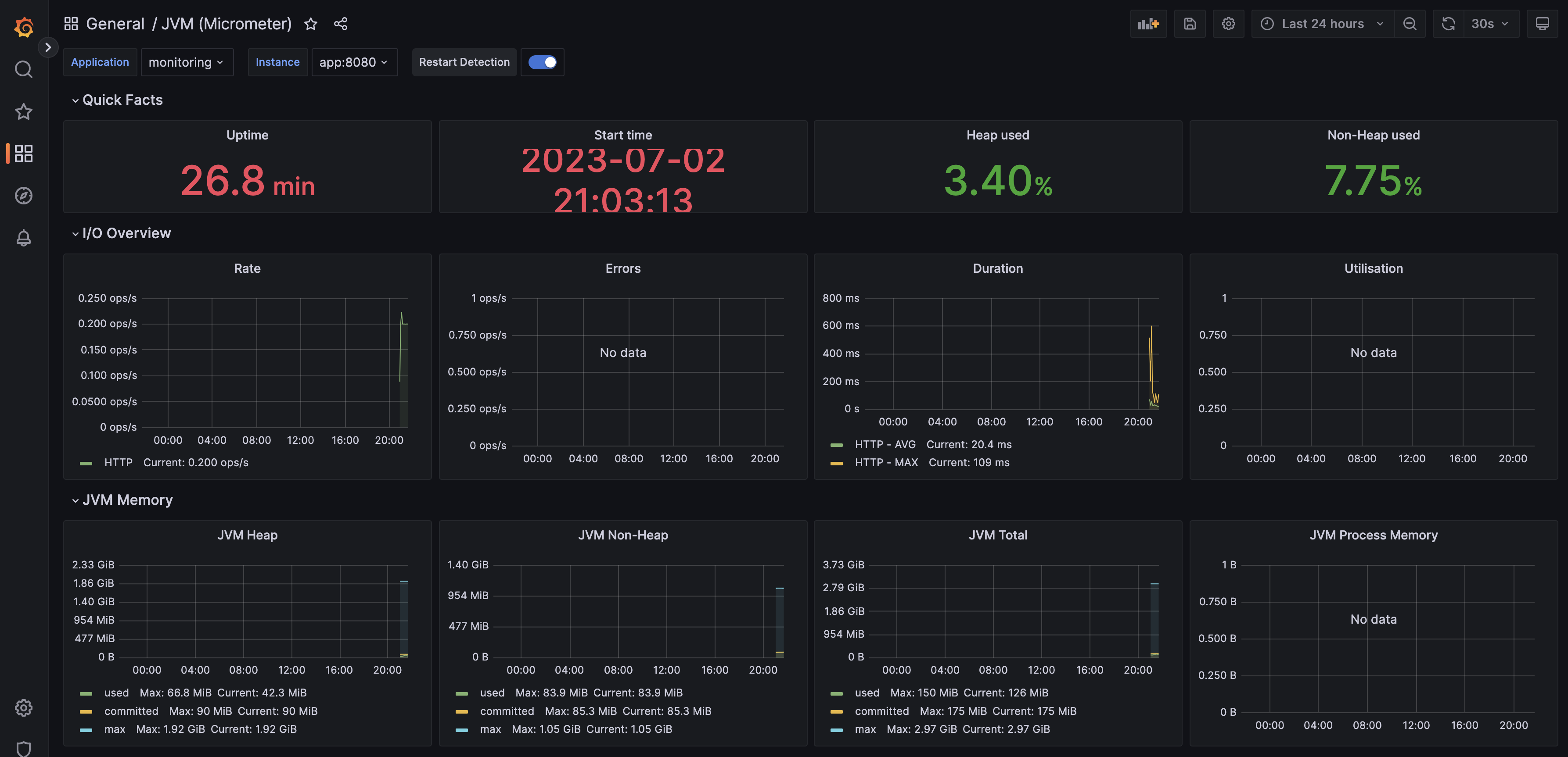 현재 애플리케이션에 아무런 요청이 발생하지 않기 때문에 대시보드에 특별한 변화가 발생하지 않는다. 애플리케이션에 트래픽을 발생시켜 대시보드의 변화를 확인하기 위해 부하 테스트 도구를 사용할 수 있다. 웹 애플리케이션 서비스의 성능을 분석하고 측정하기 위한 부하 테스트 도구인 JMeter를 사용해 트래픽을 발생시켜 보았다.