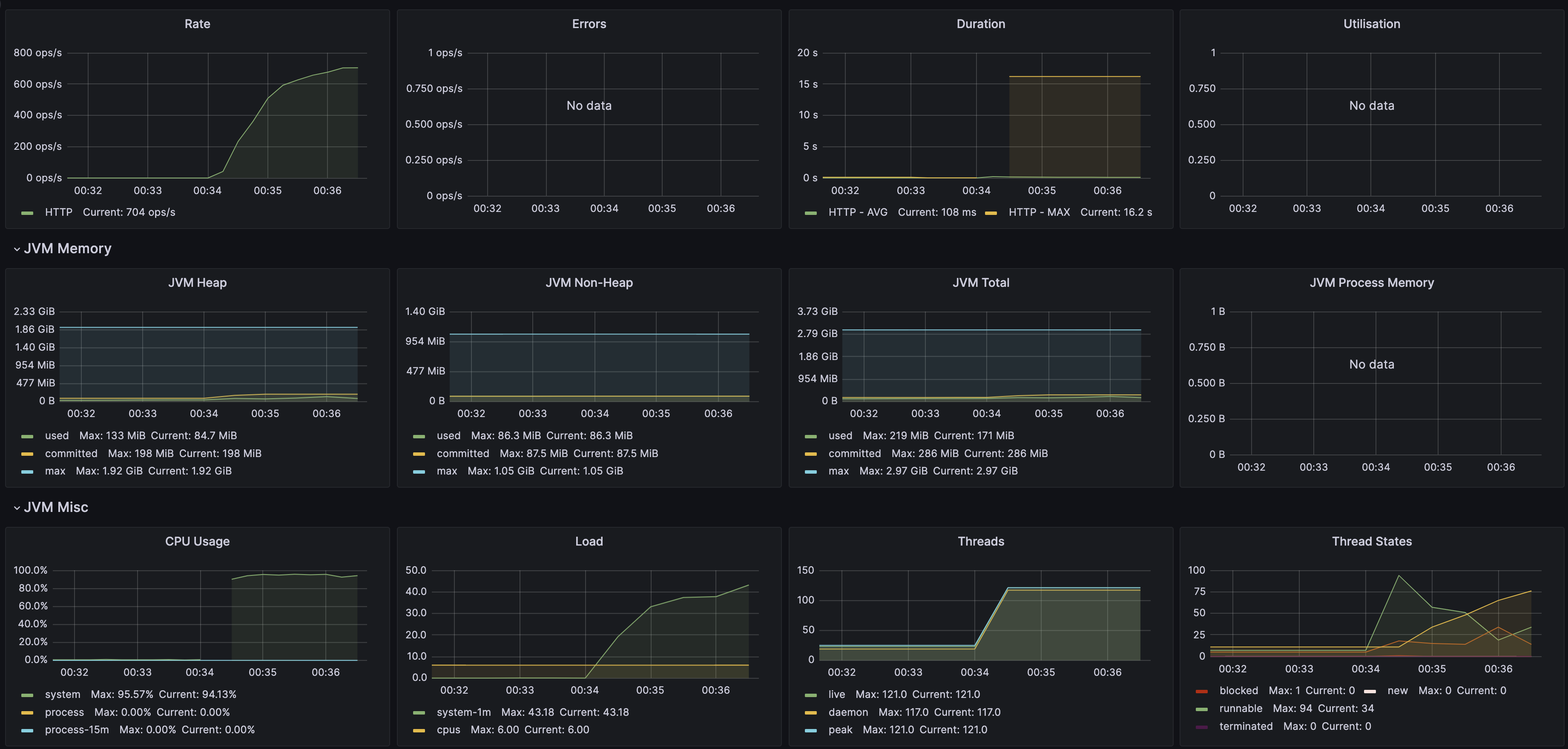 요청이 발생했을 때 그라파나 대시보드에서도 변화를 확인할 수 있다. I/O, CPU 사용량, Thread 상태 등이 실시간으로 변화는 것을 직접 확인할 수 있다.