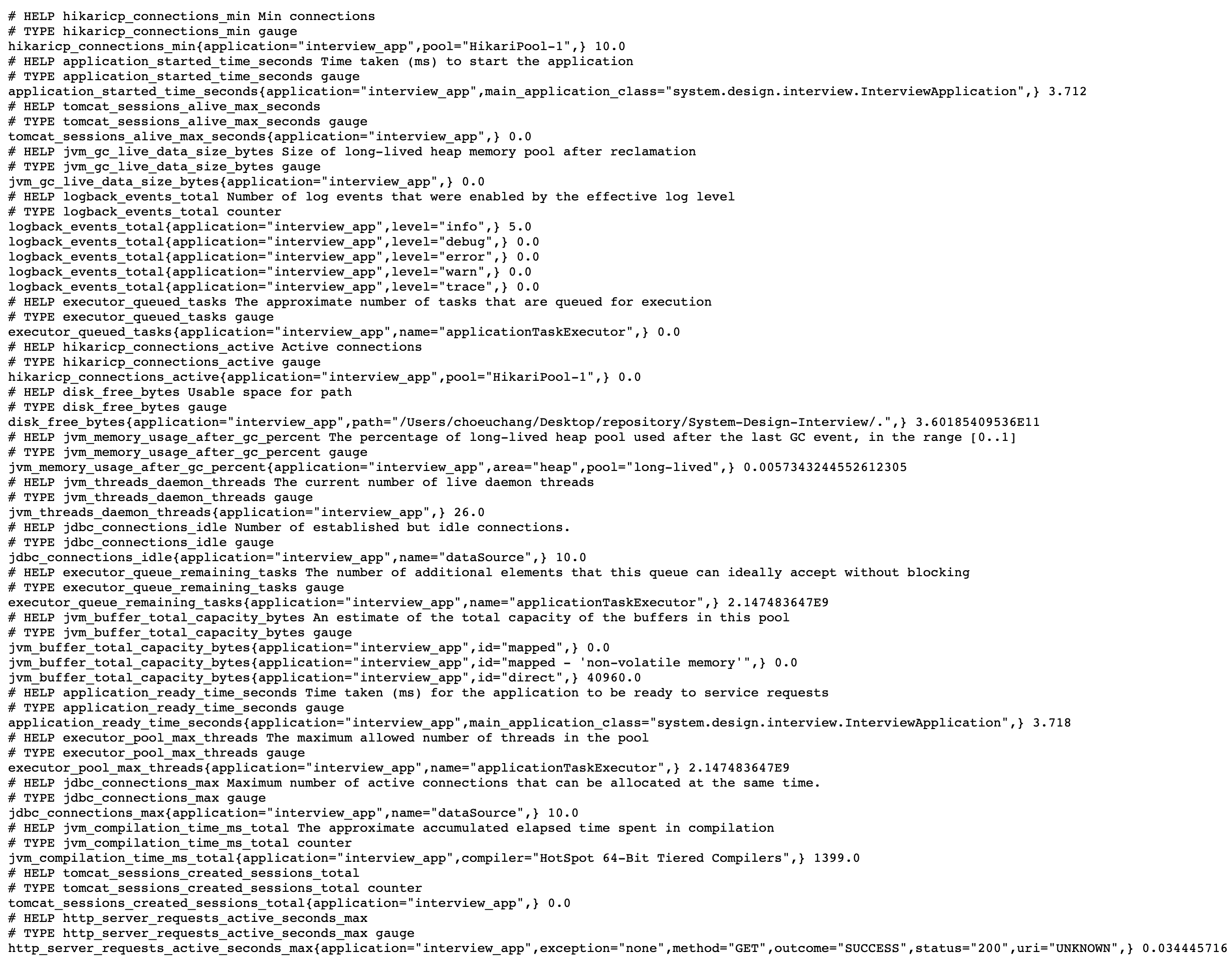 설정 후 노출된 엔드포인트인 http://localhost:8080/actuator/prometheus에 접속하면 커넥션, 세션, 스레드 등과 같은 애플리케이션 메트릭 정보를 확인할 수 있다. 설정한 태그도 올바르게 나타나고 있는 것을 확인할 수 있다.