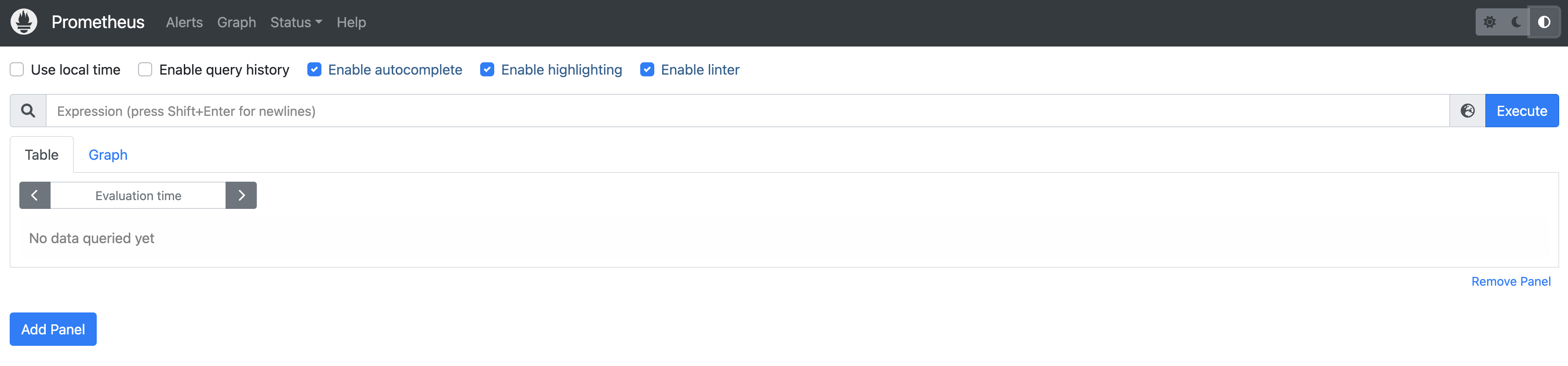 컨테이너를 정상적으로 띄웠다면 http://localhost:9090에 접속하면 볼 수 있는 화면은 위와 같다. 프로메테우스 대시보드 화면으로 검색바에 메트릭 정보를 입력해서 조회할 수 있다.
