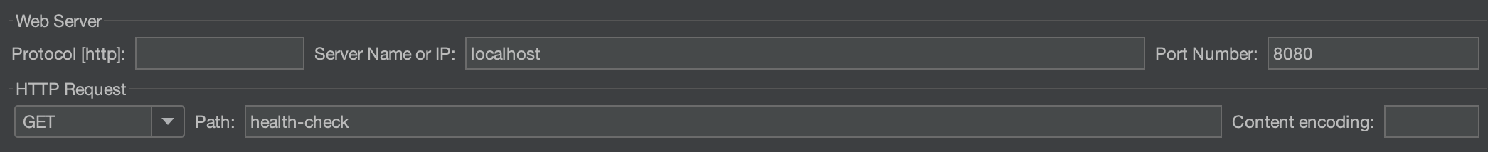 HTTP Request 화면에서 요청을 보낼 서버의 정보를 입력한다. 위의 설정은 http://localhost:8080/health-check경로에 GET 메서드를 사용하여 HTTP 요청을 보내게 되는 것이다. 설정을 마치고 JMeter를 동작시키면 설정한 동작대로 요청이 진행된다.