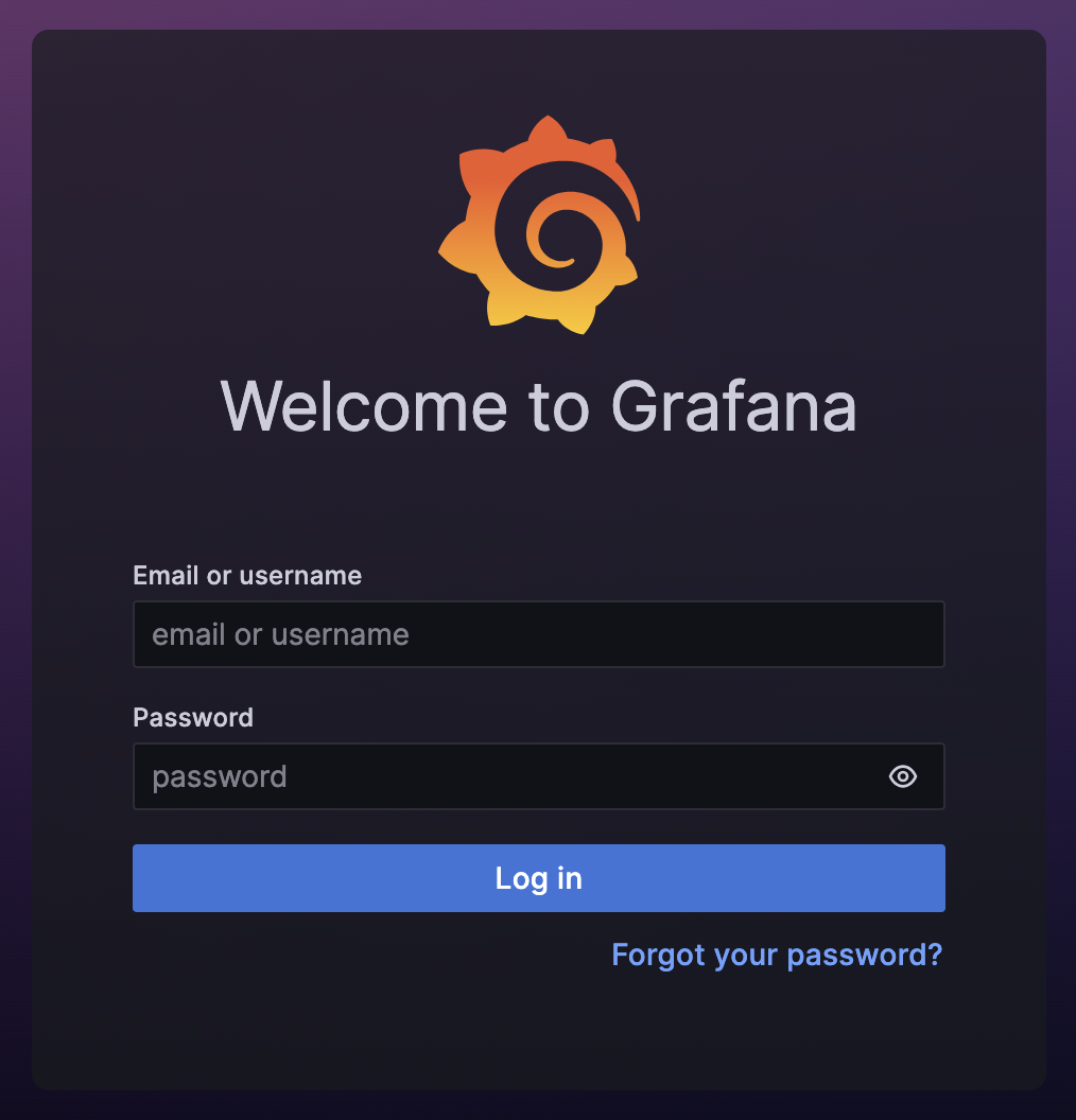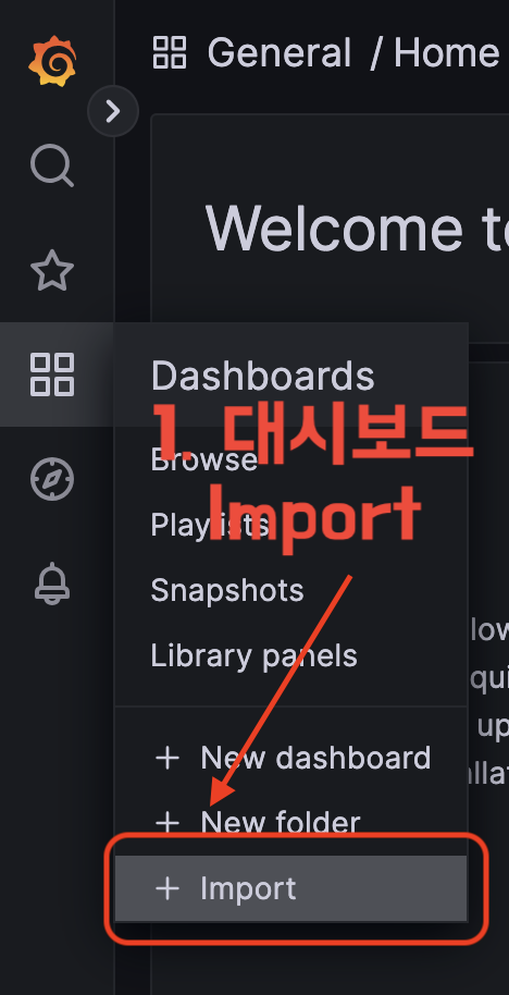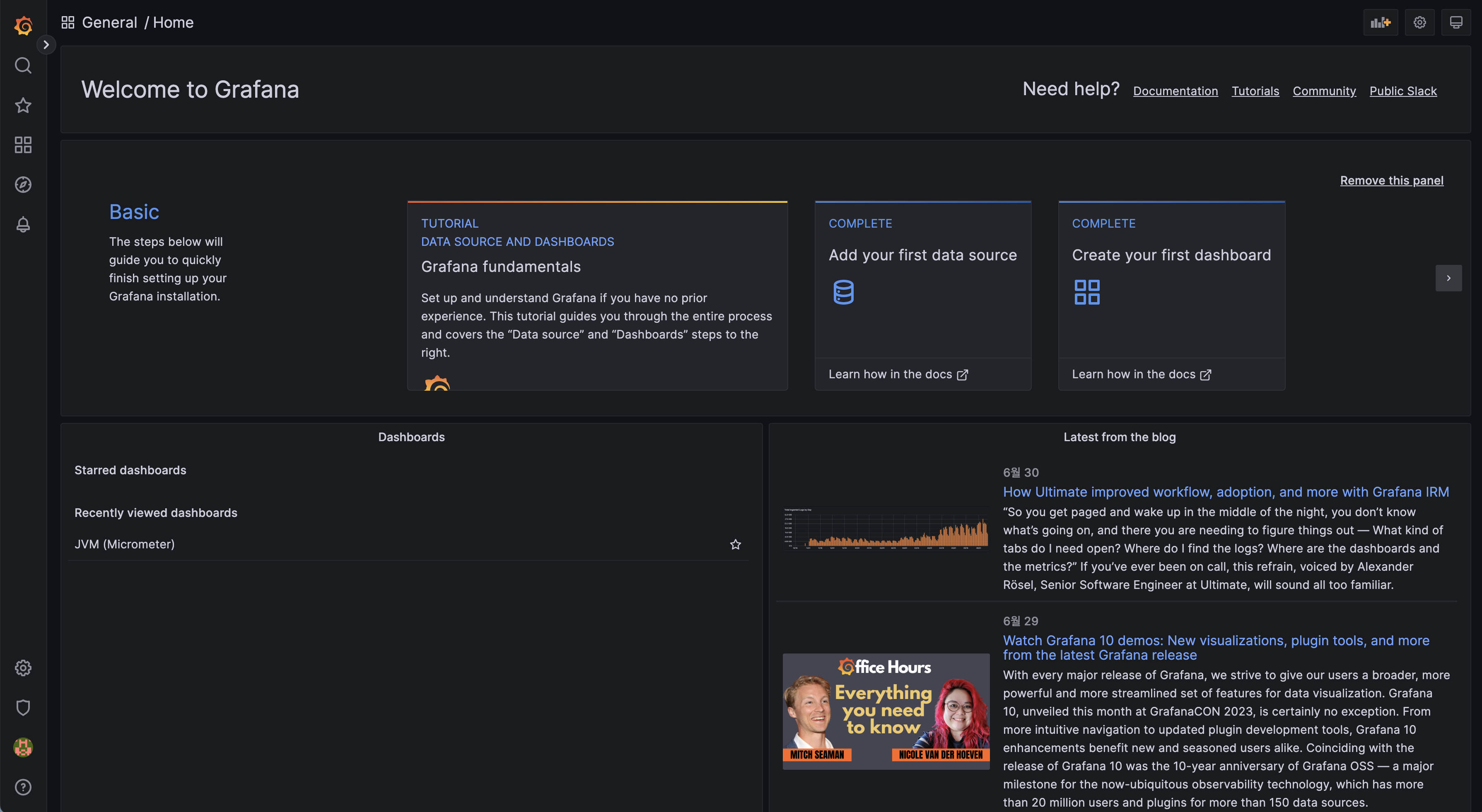 http://localhost:3000에서 동작하고 있는 그라파나에 접속하면 위와 같은 화면을 볼 수 있다. 초기 아이디와 비밀번호는 admin이기에 입력하여 접속하면 아래와 같은 화면이 나타난다.