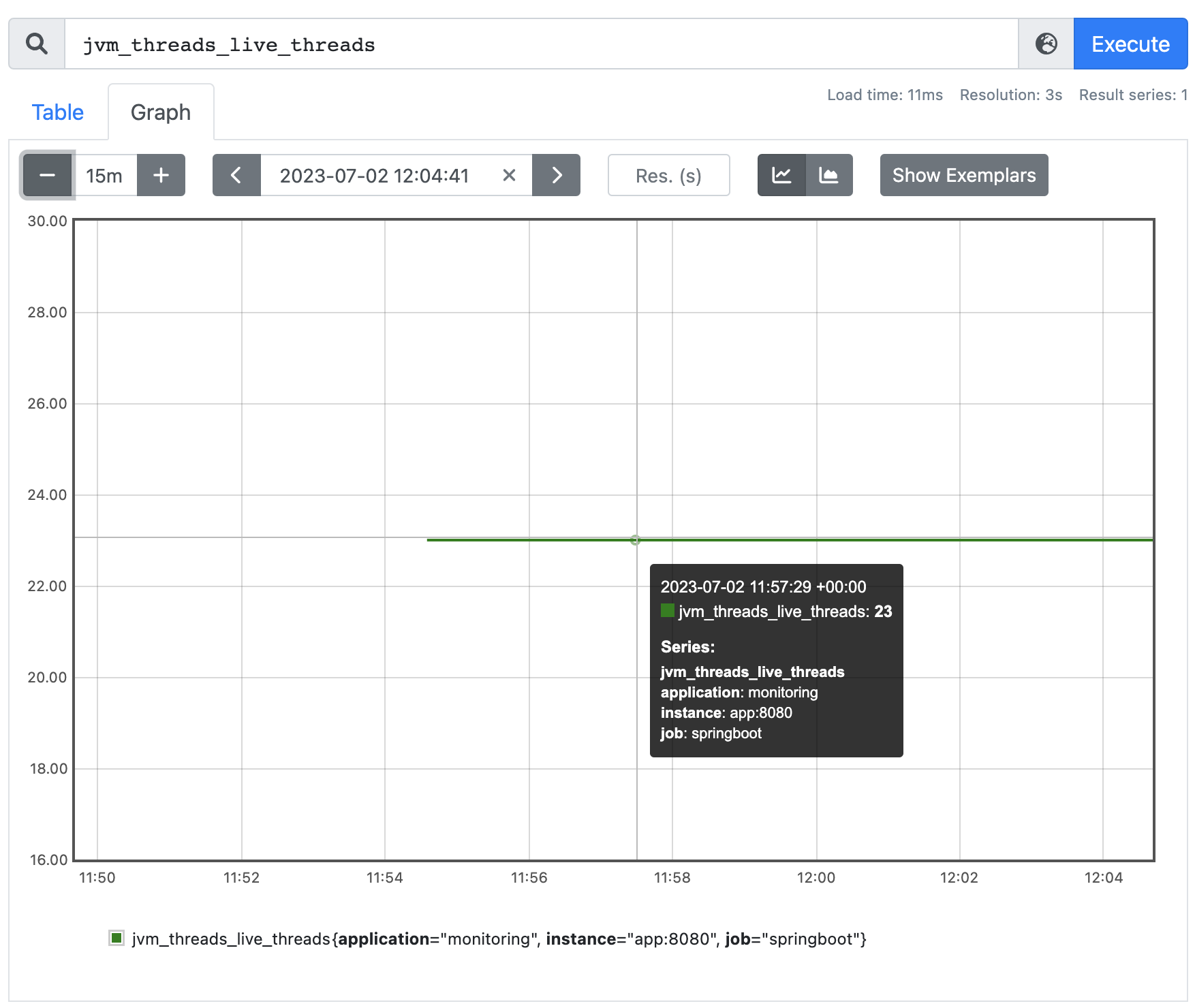 jvm_threads_live_threads 메트릭 정보를 확인하기 위해 검색해 보았더니 정상적으로 데이터를 가져오고 있다는 것을 확인할 수 있다. 애플리케이션에 요청 상황이 발생하지 않기 때문에 데이터가 변하지 않고 일정하게 유지되고 있다. 프로메테우스에서도 메트릭 데이터를 그래프로 시각화할 수 있지만 그라파나를 통해 더욱 효과적으로 시각화할 수 있다.