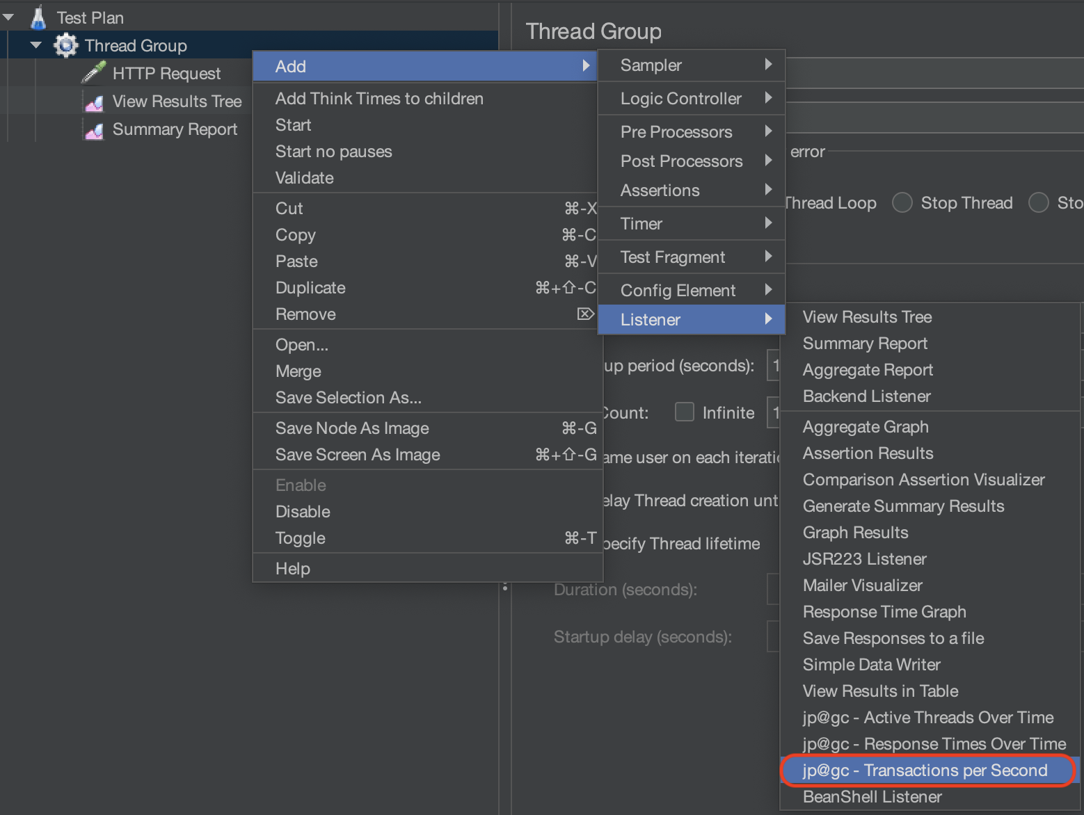 부하를 발생시키기 위한 Thread Group을 생성하고 HTTP 요청을 위한 HTTP Request와 부하에 따른 결과 확인을 위한 View Result Tree, Summary Report, Transactional per Second를 Thread Group에 추가한다.