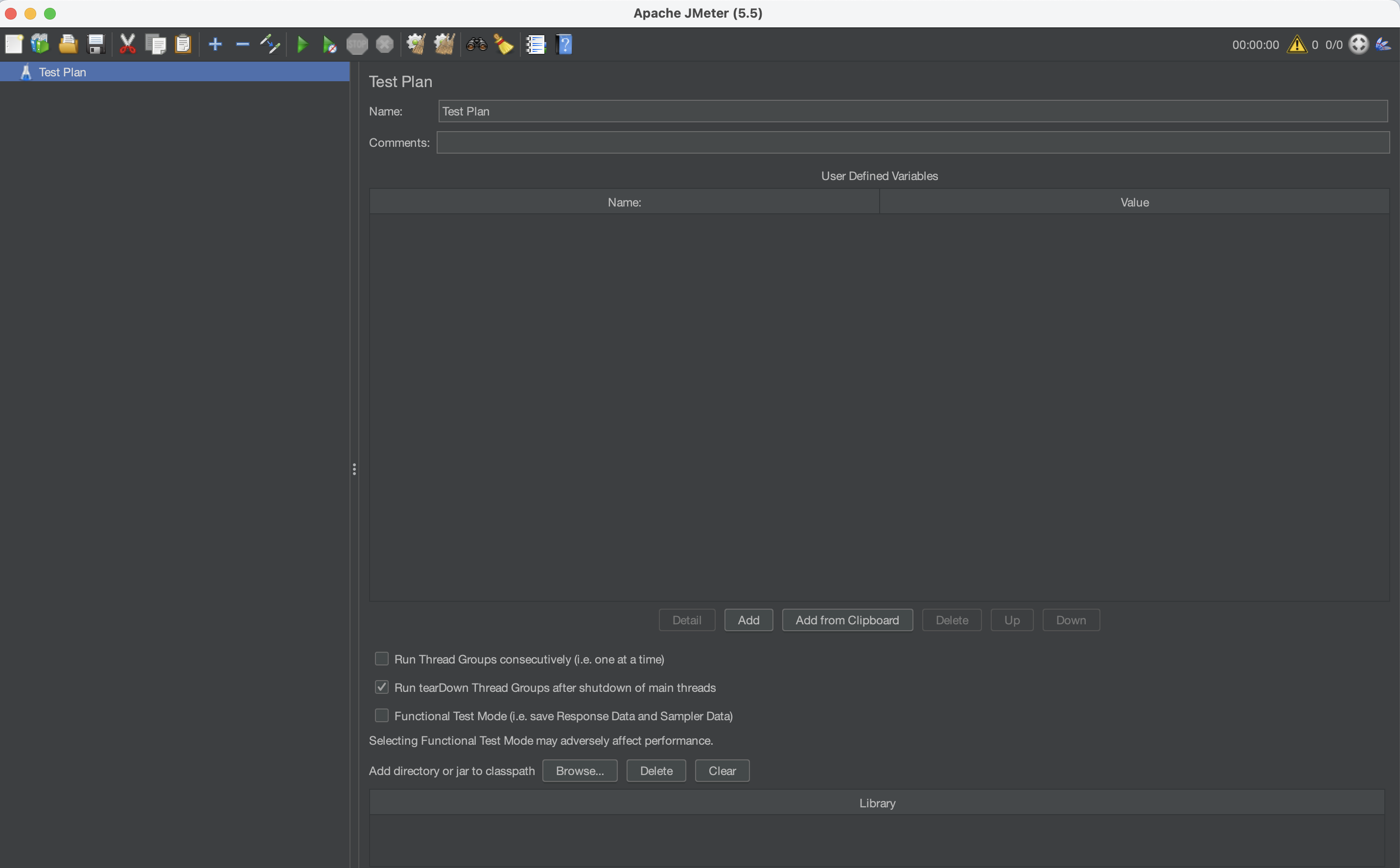 정상적으로 실행이 되었다면 위의 사진과 같이 JMeter 애플리케이션이 동작한다. HTTP 요청을 보내기 위해 몇 가지 플러그인 설치가 필요하다.